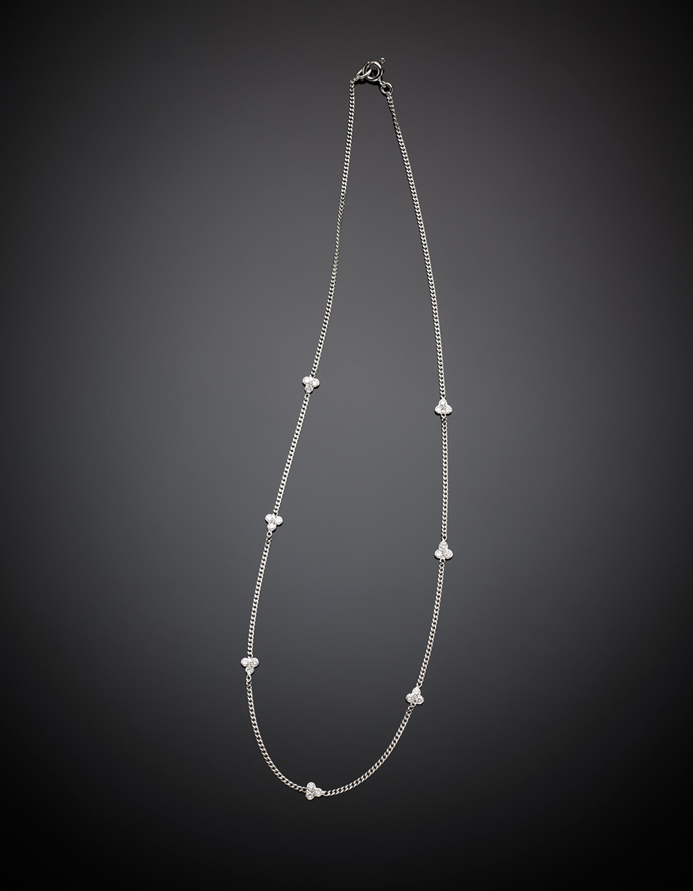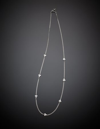 Catenina in oro bianco con sette motivi a trifoglio in diamanti taglio brillante, per complessivi ct. 0,30 circa, g 3,27, lungh. cm 40 circa.