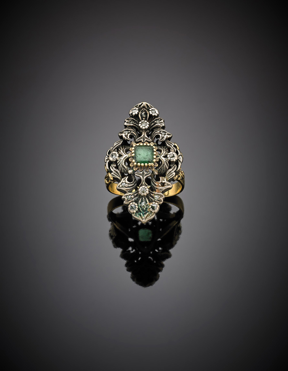 Anello oro giallo e argento diamanti e smeraldi, g 12,49 misura 11/51.