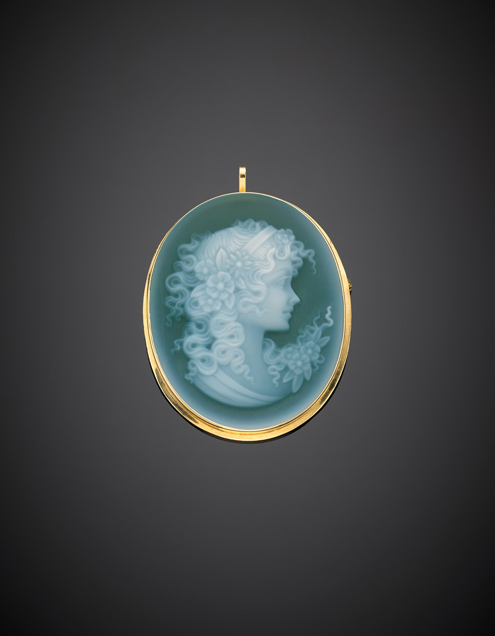 Cammeo in oro giallo e calcedonio azzurro, g 15,98, lungh. cm 5,40, largh. cm 4,30 circa.