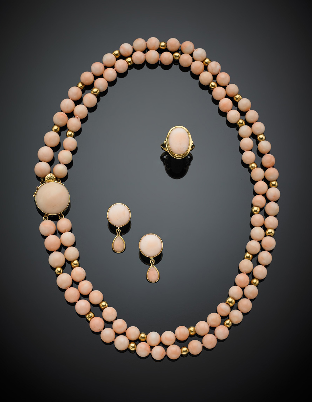 Demi-parure in oro giallo e corallo rosa composta da collier a due fili con boules di corallo da mm 9,50 a mm 8,20 circa, con distanziatori in oro giallo come la chiusura, orecchini pendenti ed anello, complessivi g 101,50.