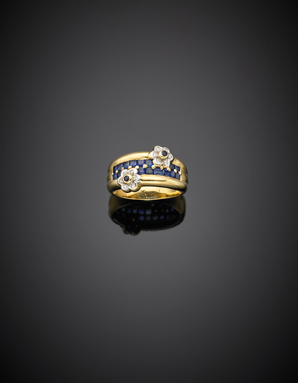 Anello in oro giallo, zaffiri carrè e piccoli fiori in diamanti, g 6,18...