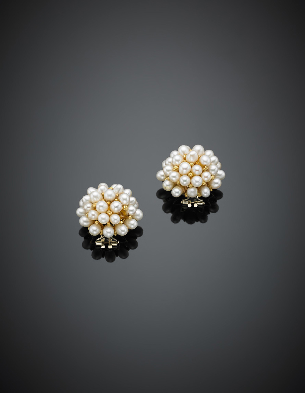 Yellow gold white ovaloid cultured pearl earclips, g 27, diam. cm 2.40. (losses)