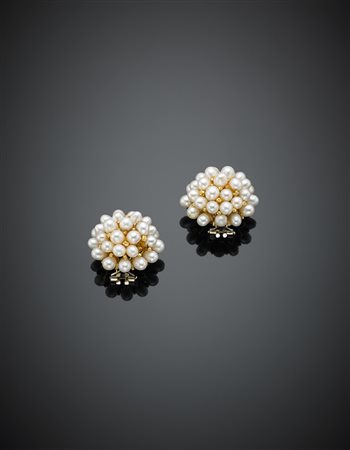 Orecchini a lobo in oro giallo con clip rifiniti con perle bianche coltivate ovaloidi, g 27, diam. cm 2,40. (mancanze)