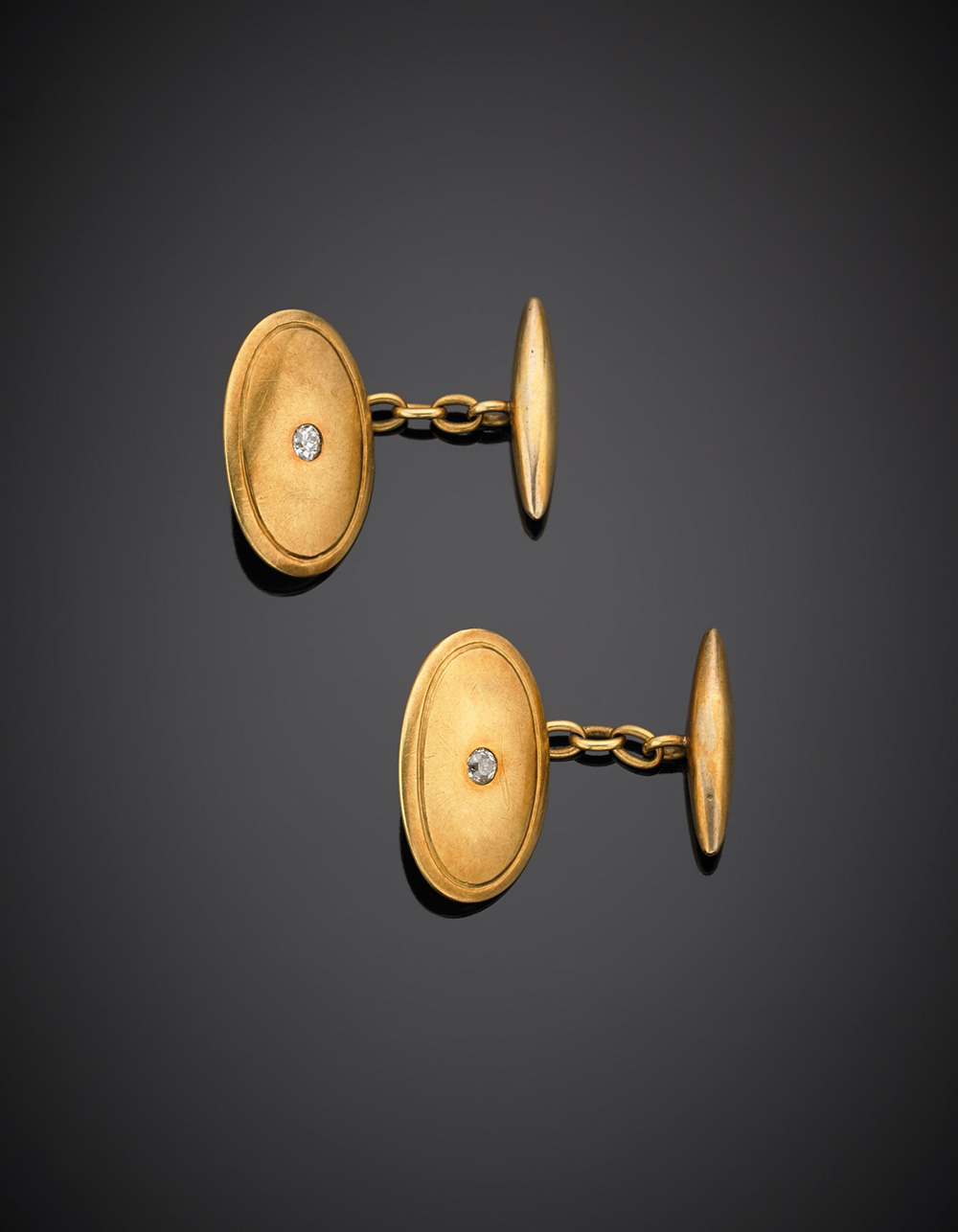 Yellow gold oval cufflinks centered by two old mine diamonds, g 9.20.