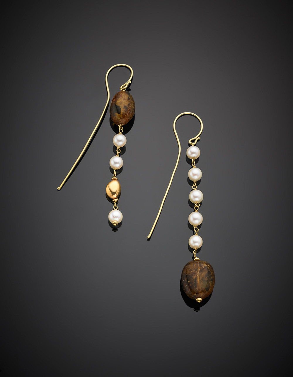Orecchini pendenti in oro, perle e ambra, g 11,10, lungh. cm 10,20 circa.
