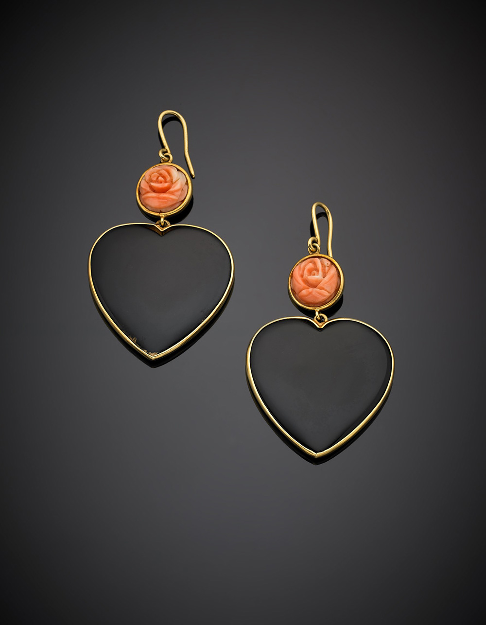 Yellow gold onyx and coral heart earrings, g 25.10, length cm 6.50, width cm 3.50 circa. Signed RONDINA
