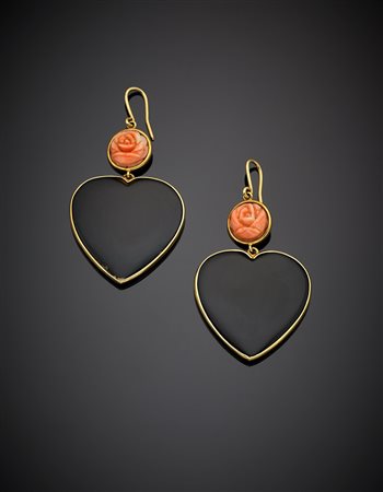 Orecchini pendenti in oro giallo con corallo e onice a cuore, g 25,10, lungh. cm 6,50, largh. cm 3,50 circa. Firmato per esteso RONDINA