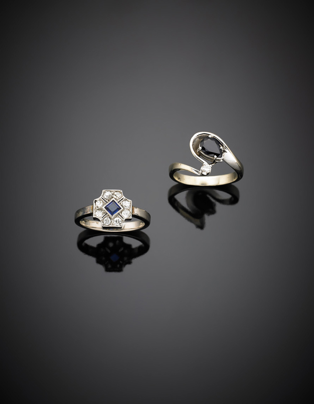 Due anelli in oro bianco con diamanti e zaffiri, g 6,80.