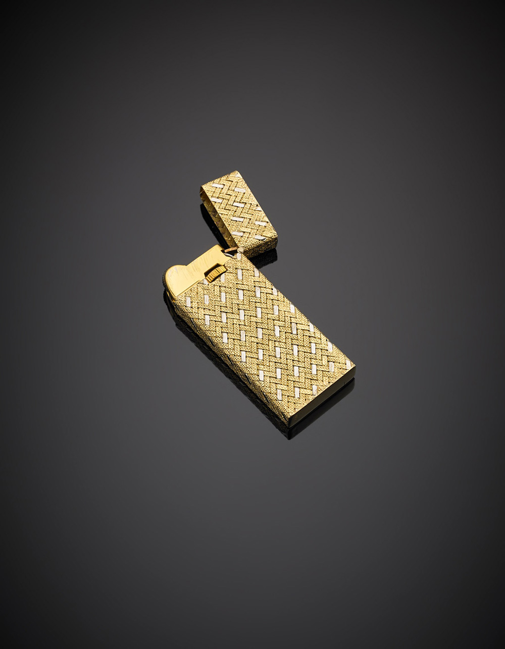 Accendino rivestito in oro giallo e bianco con lavorazione a cestino, cm 5,60x2,30x0,60 circa, g 34,30.