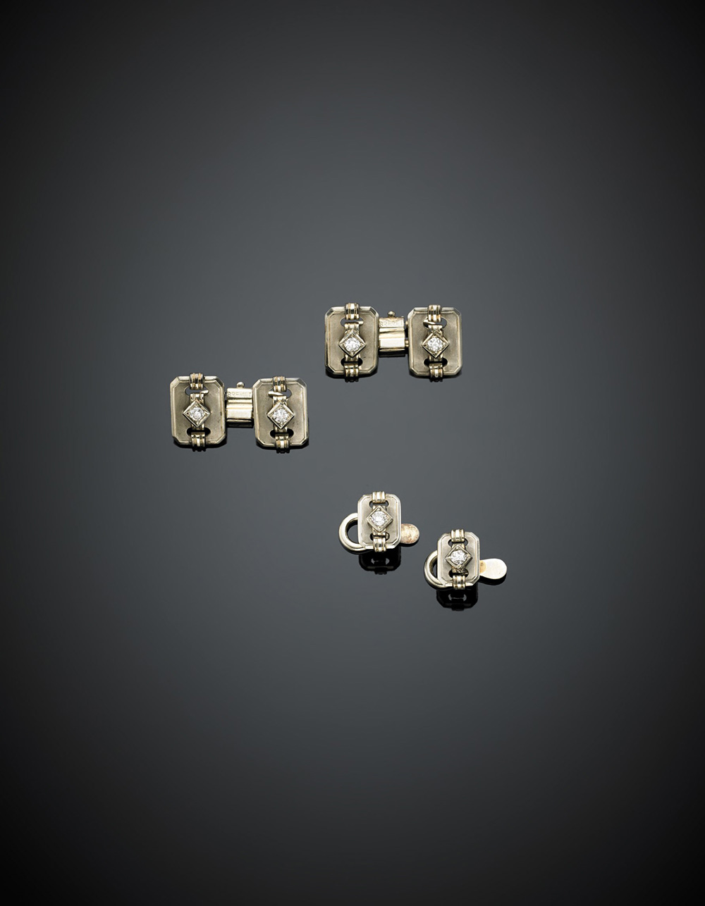 Lotto di gemelli e bottoni in oro bianco, lucido e satinato, rifiniti con diamanti, g 10.