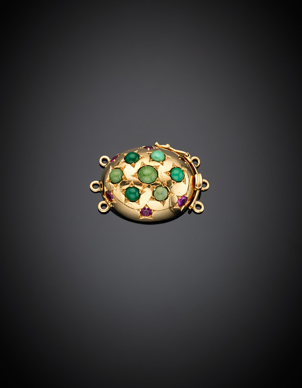Chiusura ovale bombata in oro giallo con turchesi e rubini, g 10,17.