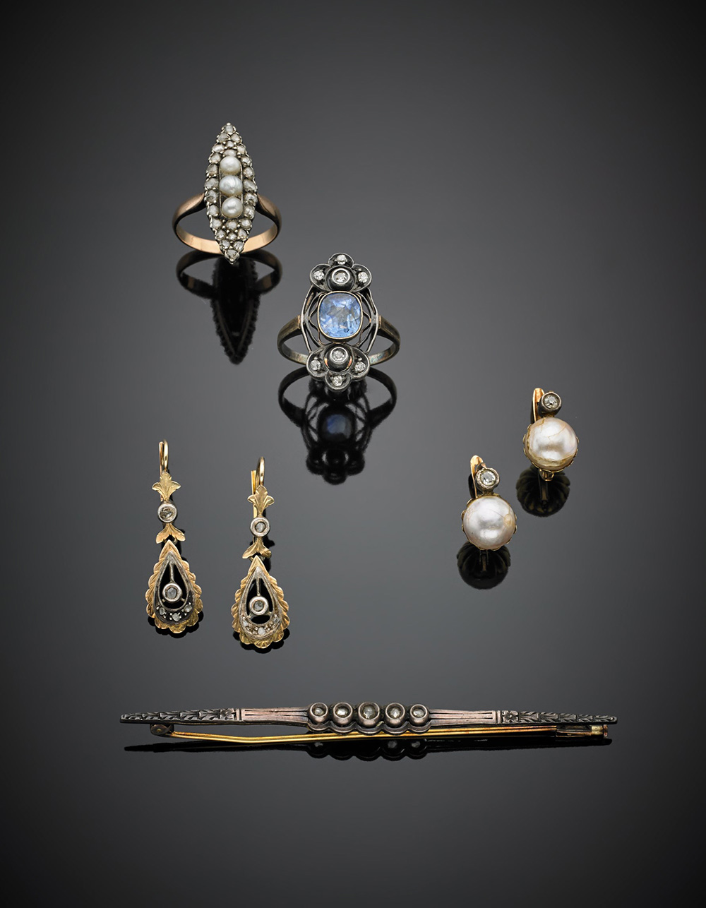 Lotto composto da due anelli, una spilla e due paia di orecchini in oro da 333/1000 a 750/1000 con argento rifiniti in diamanti, perle e zaffiro, complessivi g 21,90.