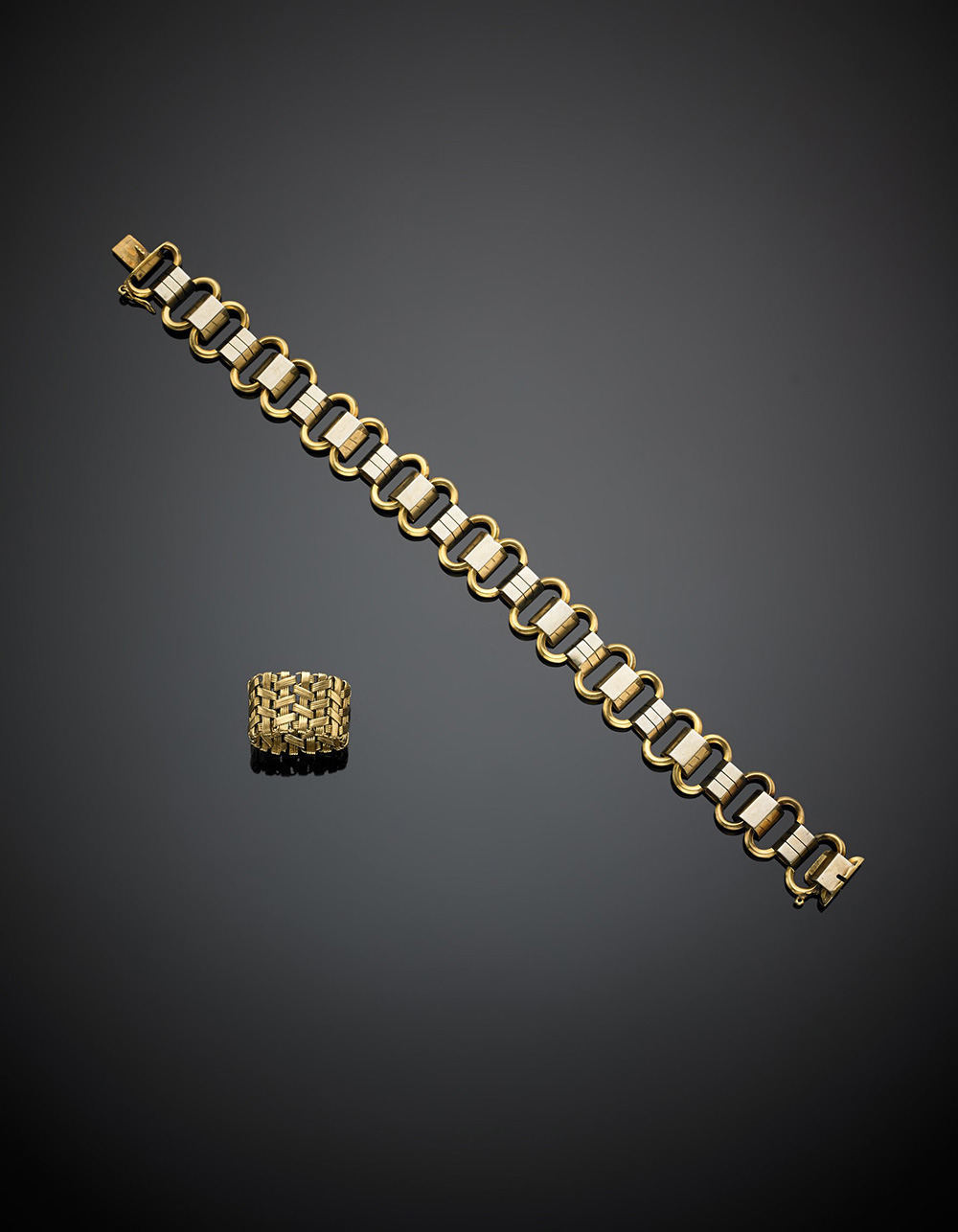 A bi-coloured gold lot composed of a modular bracelet and a woven band ring, g 32.90, length cm 19 circa size 13/53.
