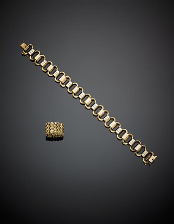 Lotto composto da bracciale modulare in oro giallo e bianco, anello a fascia intrecciata, g 32,90, lungh. cm 19 circa misura 13/53.