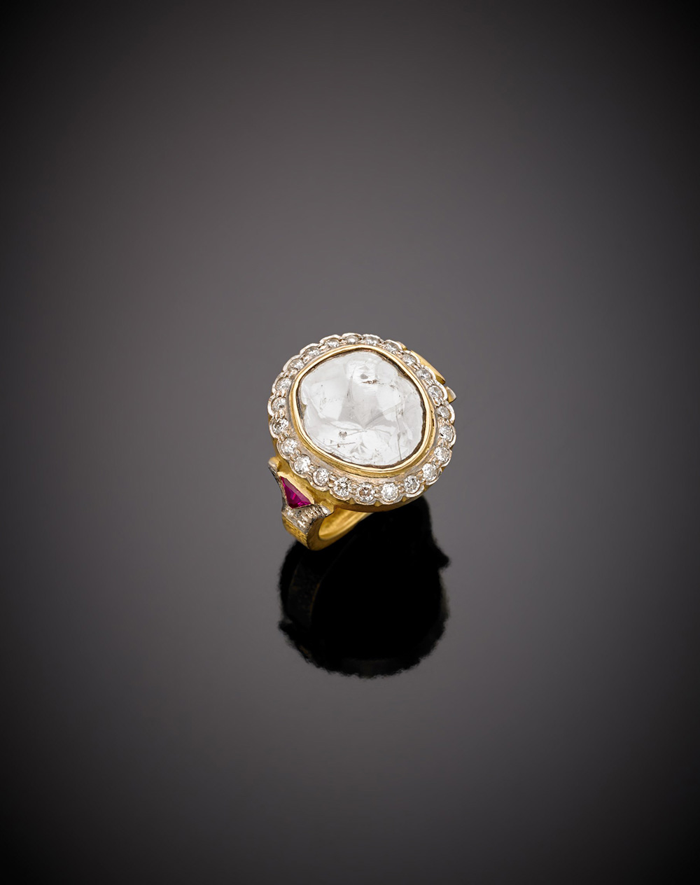 Yellow gold "indian style" ring centered by a colourless irregular flat diamond of mm 15x13 circa, with a diamond surround and accented with two triangular rubies on the stem, g 9.90 size 12/52.