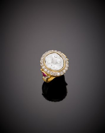 Anello in oro giallo in "stile indiano", centrato da un diamante irregolare, flat incolore di mm 15x13 circa contornato da diamanti taglio brillante e trattenuto da due rubini triangolari sul gambo, g 9,90 misura 12/52.