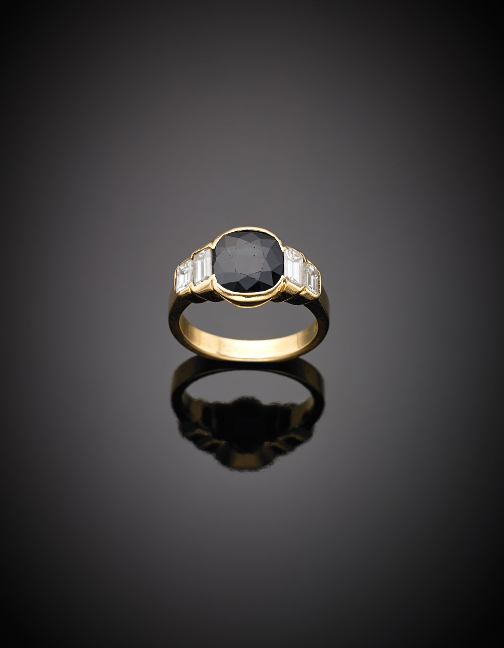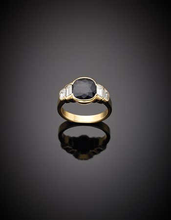 Anello in oro giallo con zaffiro a cuscino di ct.3,20 circa e diamanti a baguette per complessivi ct.1,10 circa, g 7,50 misura 15/55.