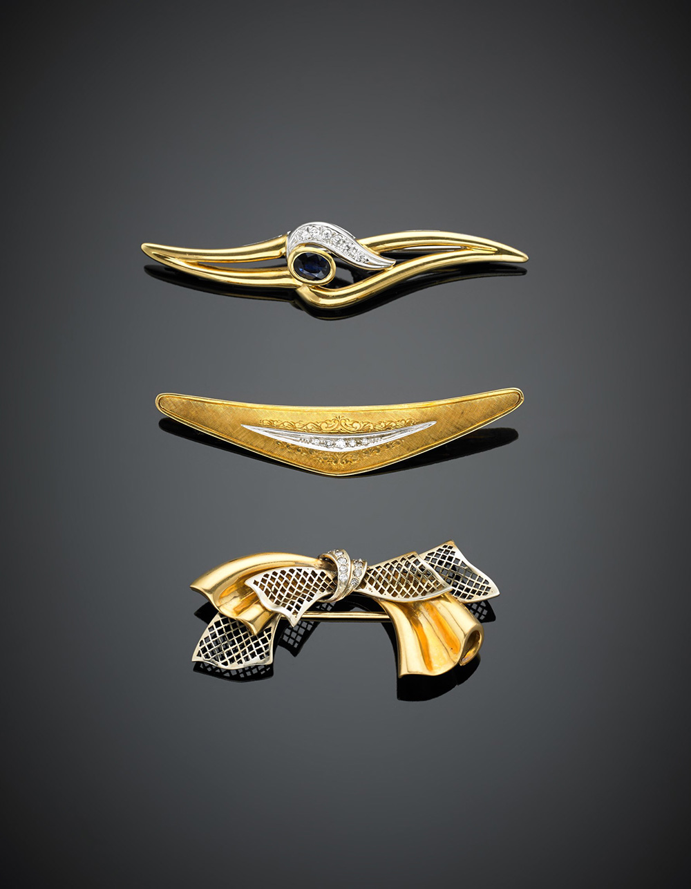 Lotto di tre spille di varie tipologie in oro giallo e bianco rifinite con diamanti e uno zaffiro ovale, g 29,80.