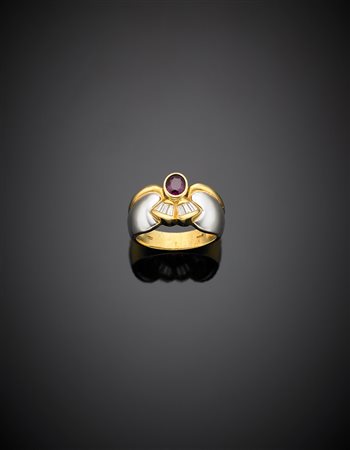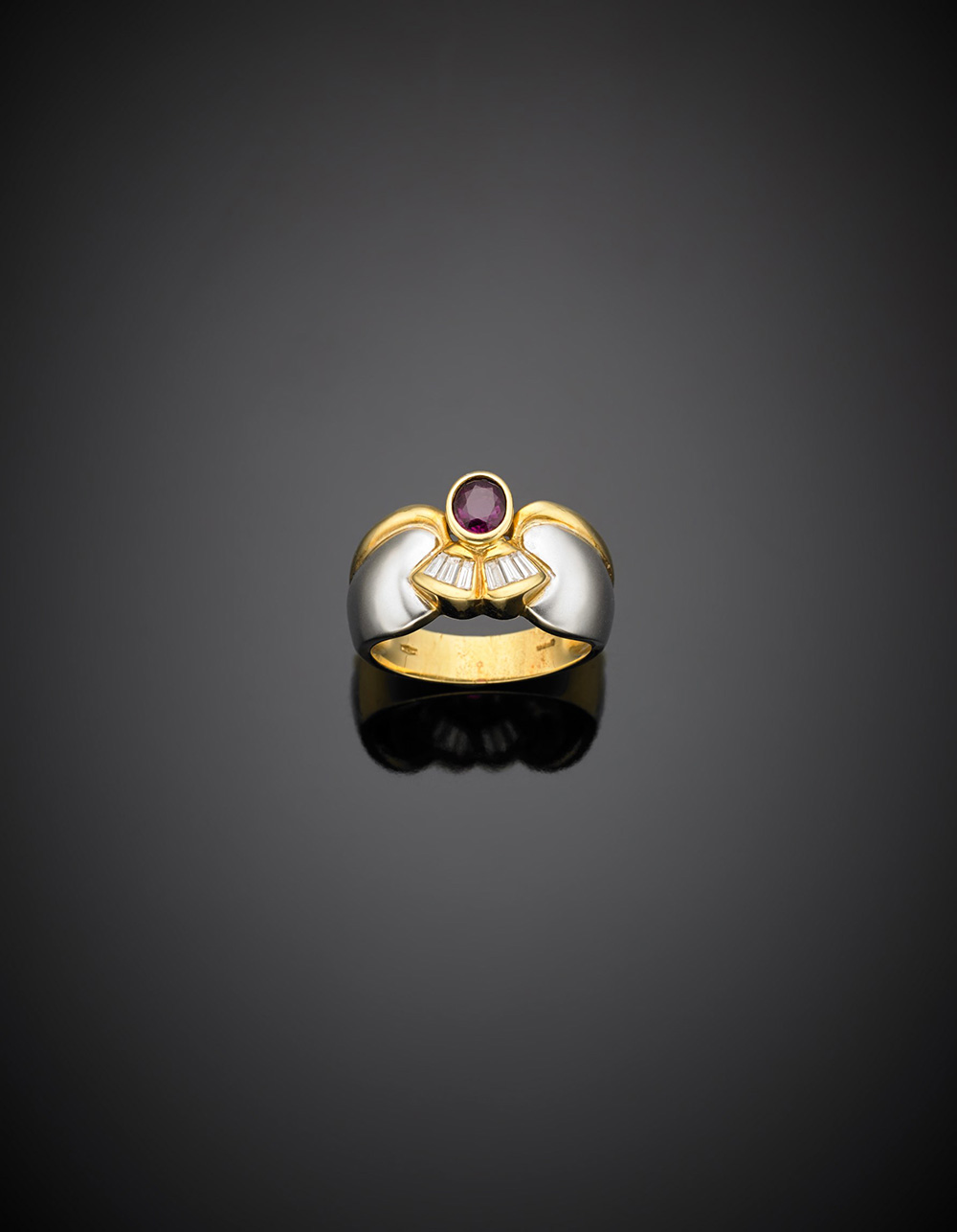 Anello in oro bianco e giallo, con rubino e diamanti tapered, g 8,48 misura 15/55.