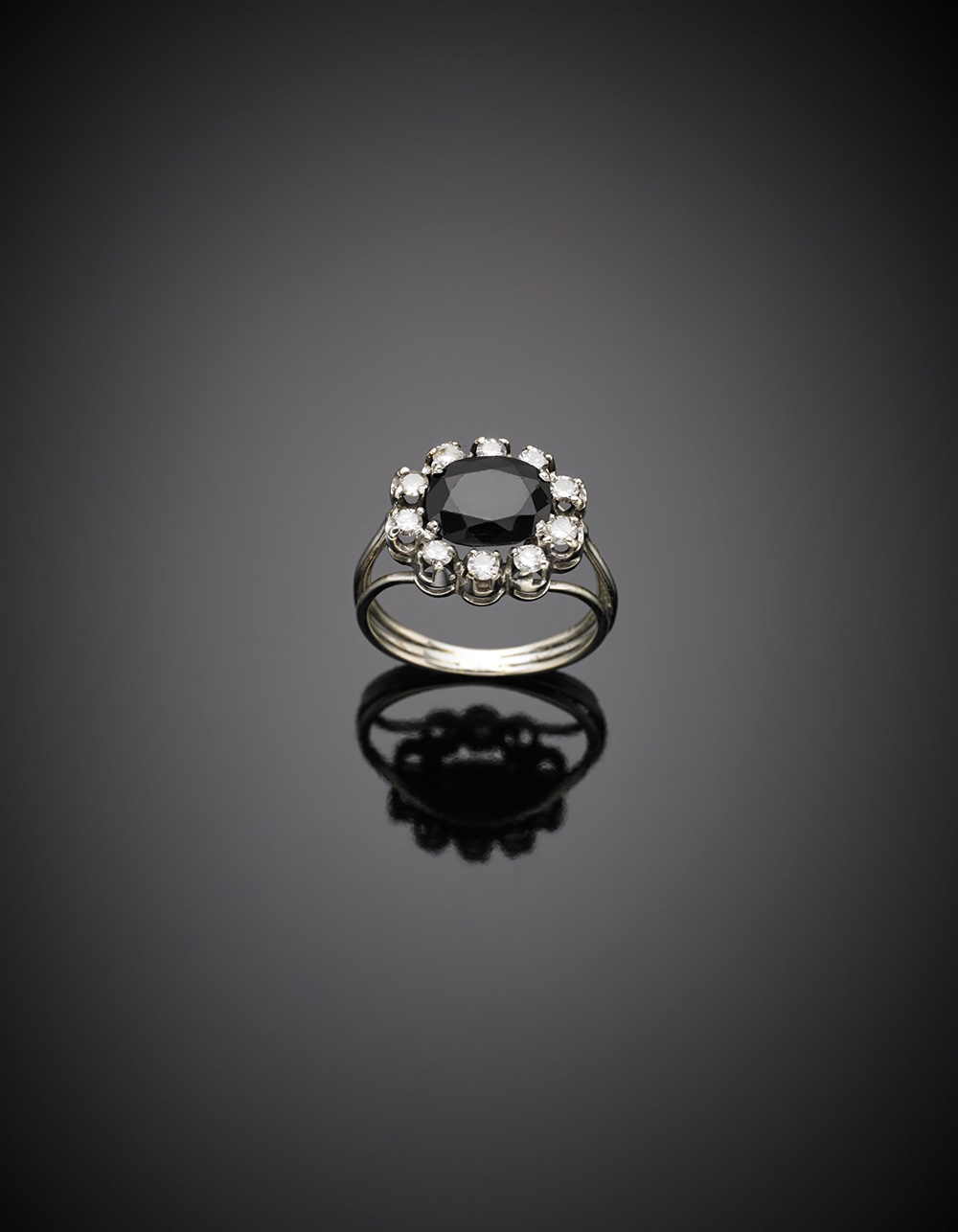 White gold oval ct. 3.02 circa sapphire ring with a diamond surround g 4.31 size 16/56.