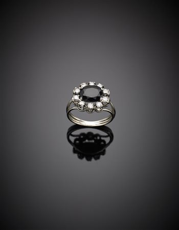 Anello in oro bianco con diamanti rotondi a contornare uno zaffiro ovale di...