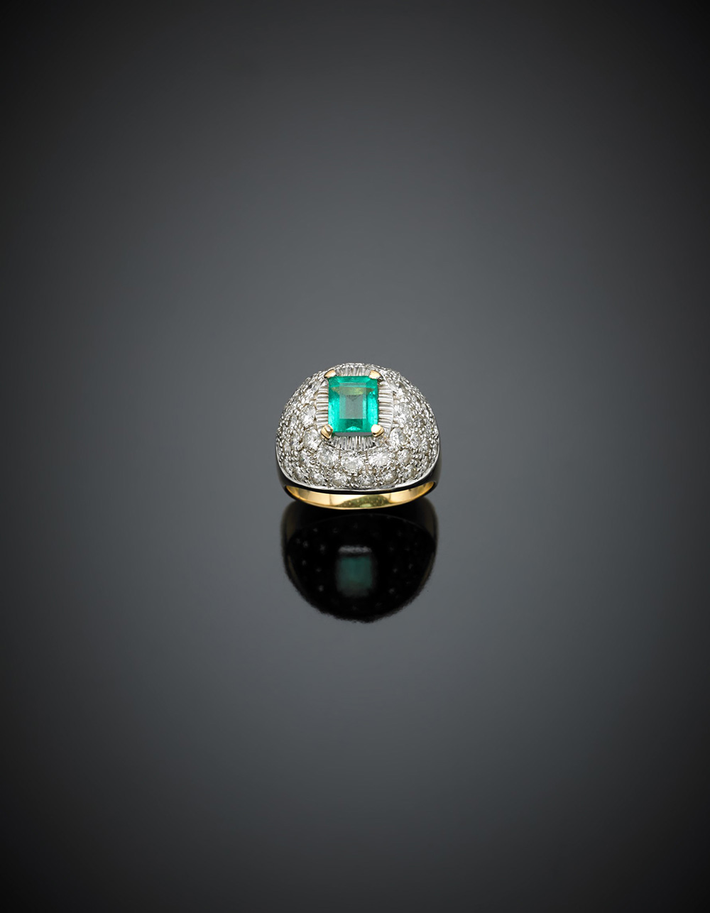 Anello in oro giallo e bianco con pavè di diamanti rotondi a contornare uno smeraldo ottagonale di ct.1,10 circa, g 8,90 misura 15/55.