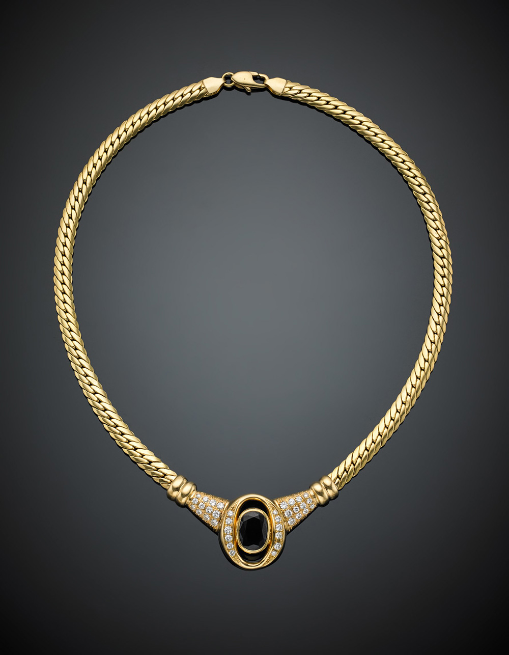 Collier in oro giallo con al centro uno zaffiro ovale rifinito con diamanti rotondi, g 28,30, lungh. cm 40 circa.