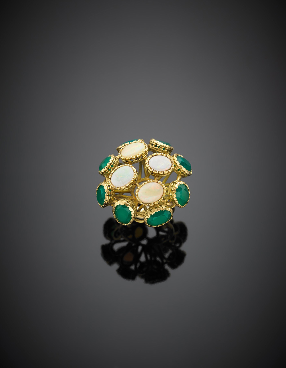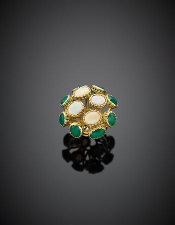 Anello in oro giallo a cupola con opali nobili e quarzo microcristallino verde g 16,10 misura 10/50.