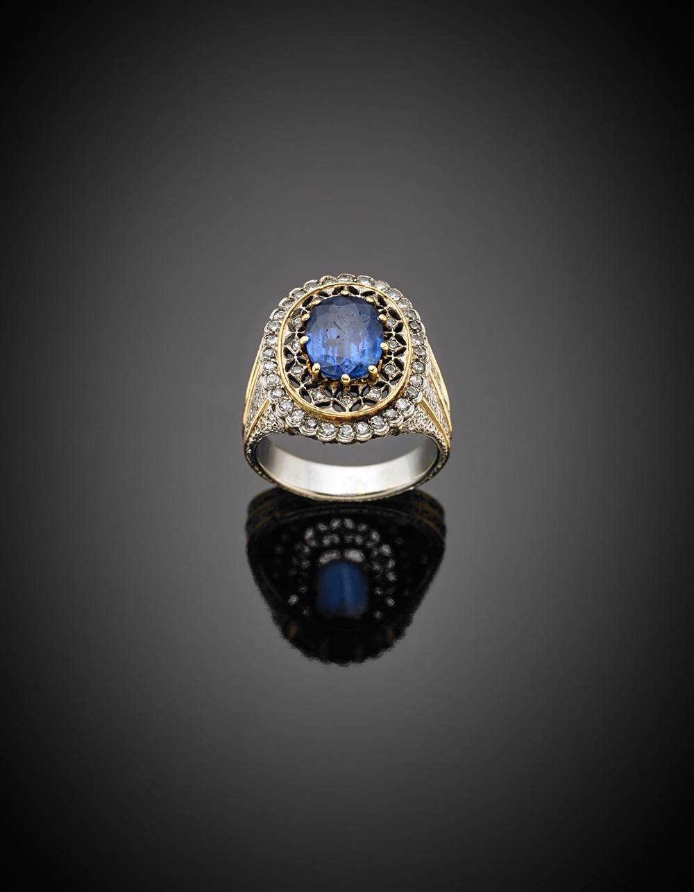 Anello in oro bianco e giallo di forma ovale inciso e traforato con probabile doppietta di zaffiro e diamanti taglio huit-huit, g 7,59 misura 13/53.