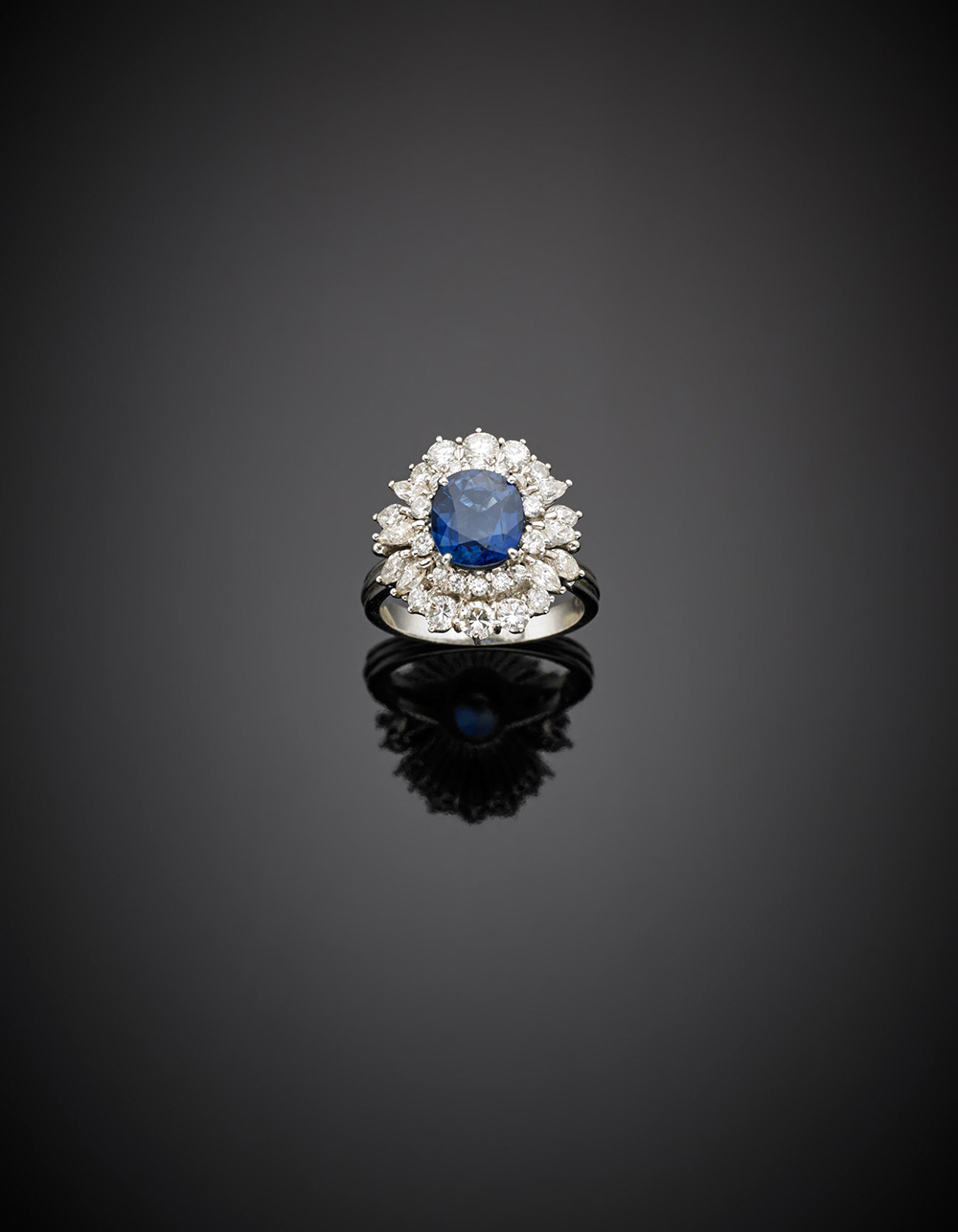 White gold, round and marquise diamond ring centered by a ct. 2.20 circa oval sapphire, g 6.79 size 12/52.