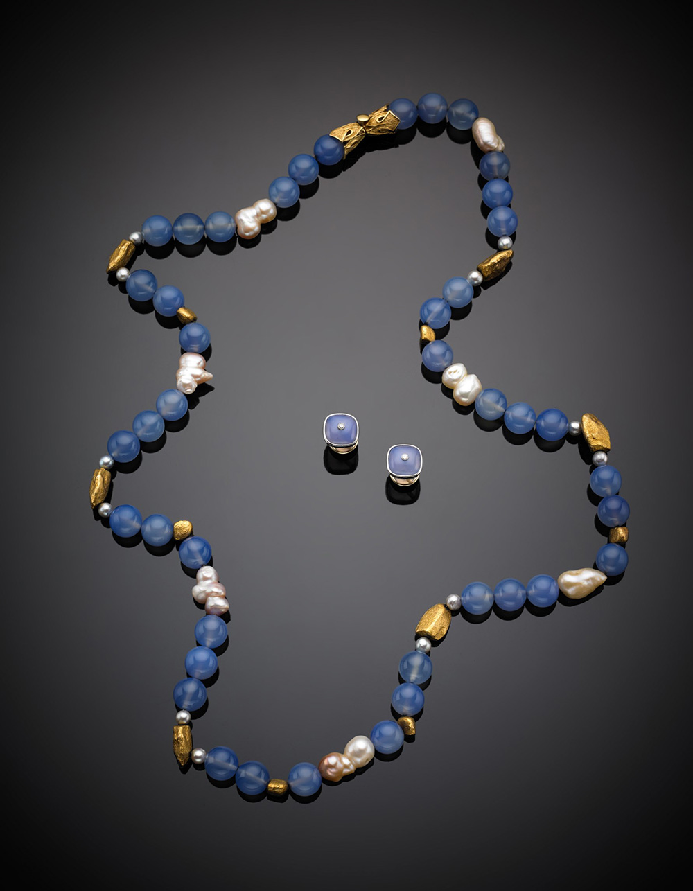 Lotto composto da collana fantasia con sfere in calcedonio, perle scaramazze e "pepite" in oro giallo, e orecchini a bottone in calcedonio con due piccoli diamanti, complessivi g 135,98, lungh. cm 83 circa.