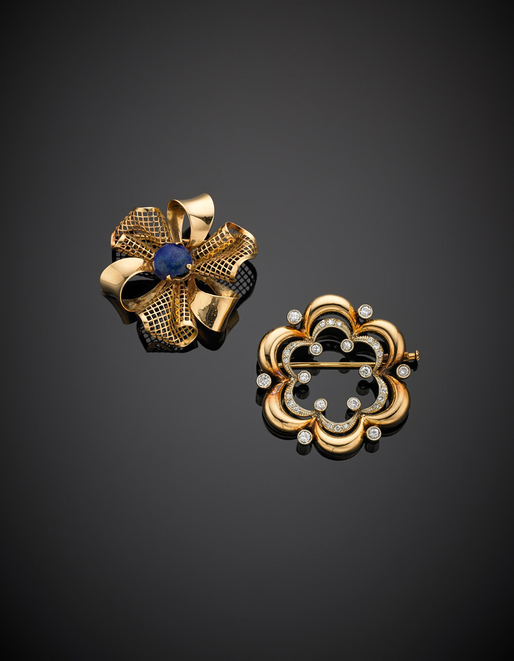 Lot composed of two yellow, white and red gold brooches, one with diamonds, the other with a cabochon blue stone, in all g 16.68.