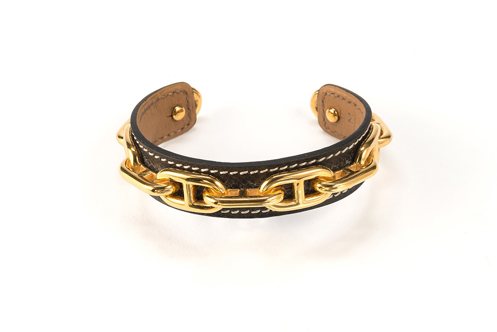 Brown leather with an applied gilt-metal metal chain cuff bracelet., with original pouch size M
