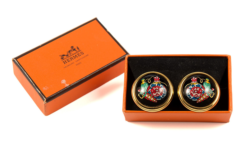 HERMES Orecchini in metallo color oro e smalti multicolori raffiguranti delle...