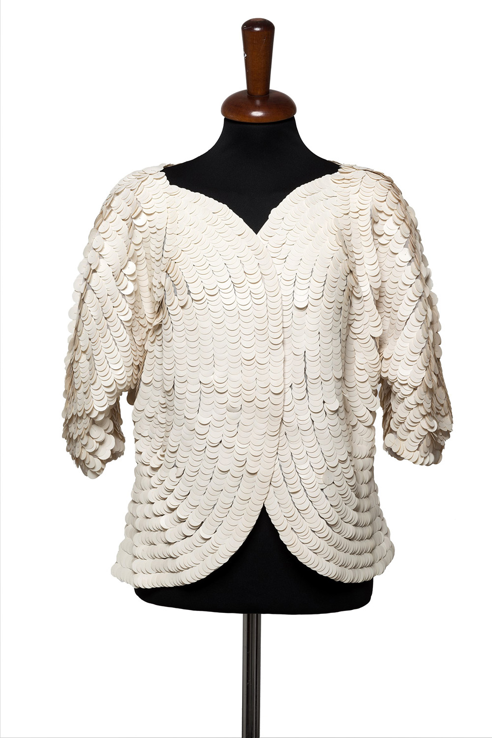 Ivory short sleeved jacket covered with large opaque sequins (size 42) (defects)