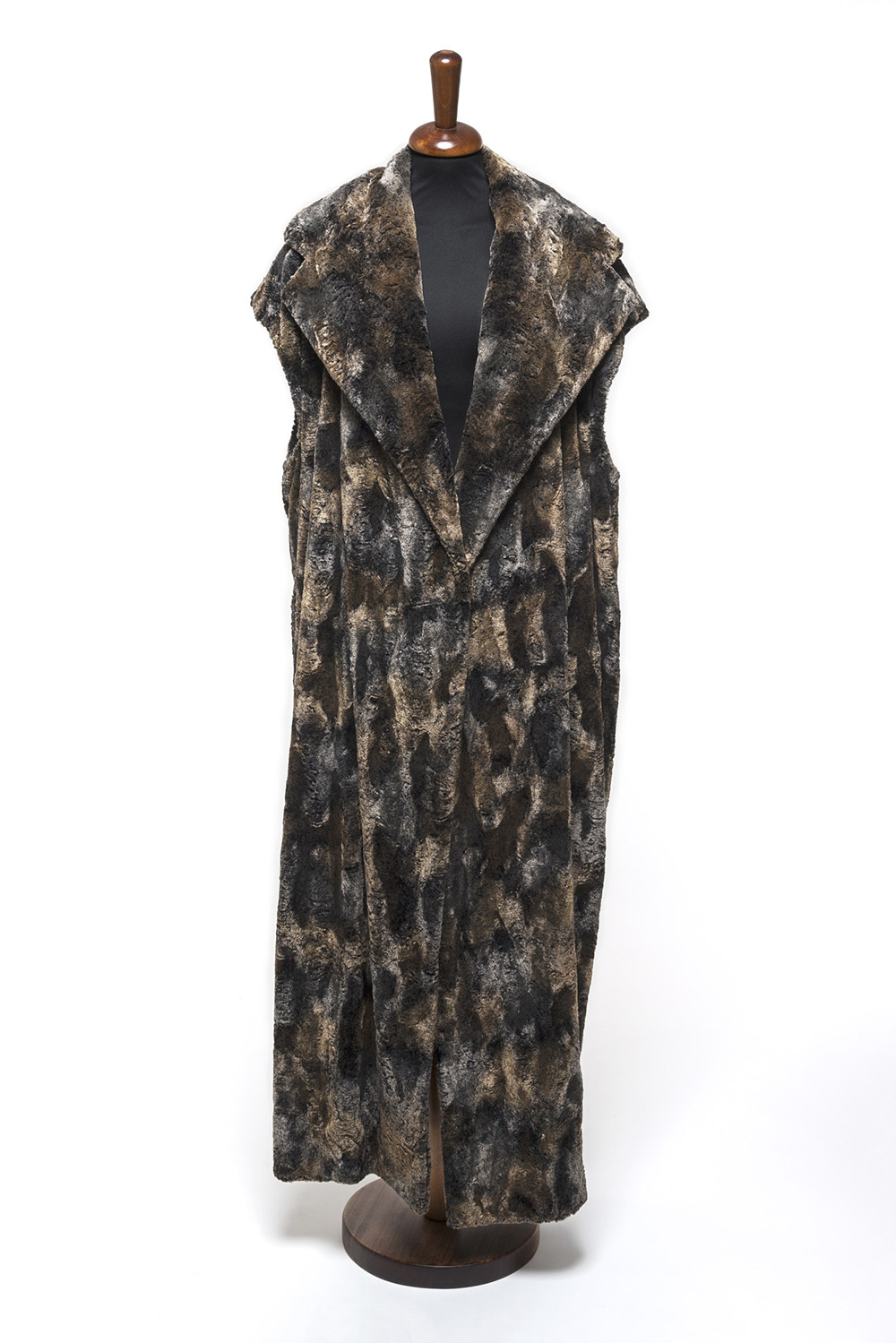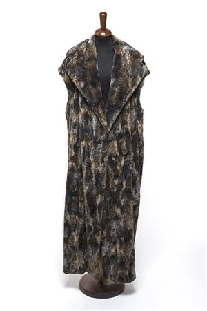Lunga ecopelliccia senza maniche variegata sui toni del marrone, grigio e beige, con grande collo (tg 42)