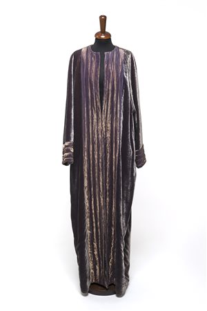 Cappotto lungo di ispirazione medio-orientale in velluto viola cangiante, con inserti in garza anch'essi cangianti con fodera in seta (tg 42/44)