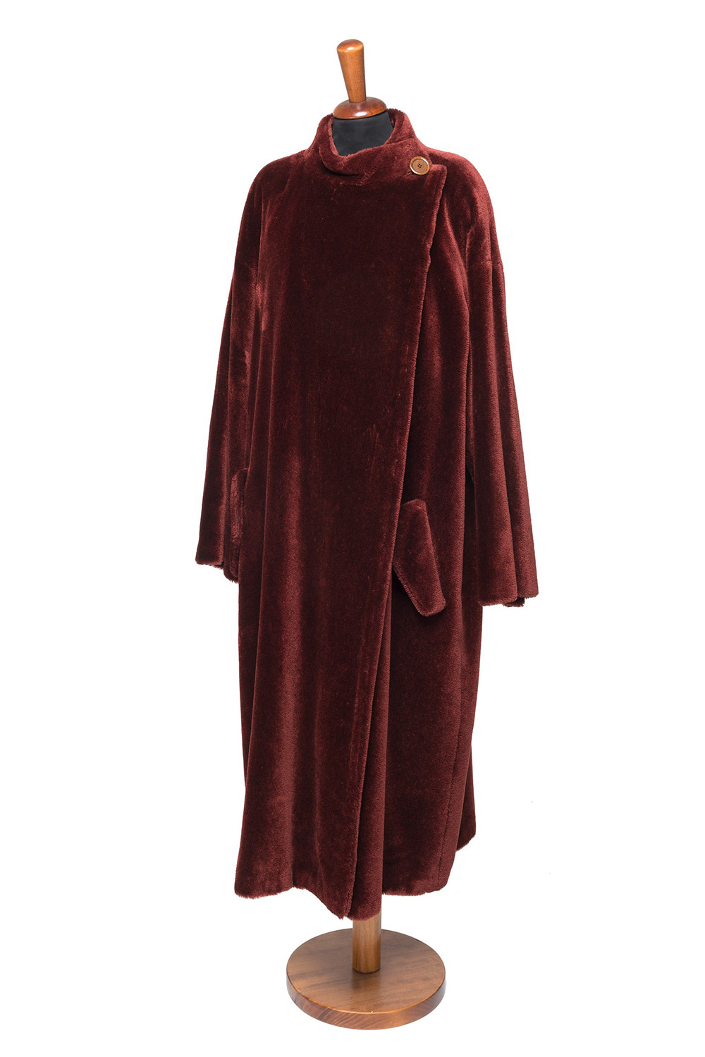 Lungo cappotto in ecopelliccia sintetica color mattone, chiusura laterale, doppia tasca (tg 42)