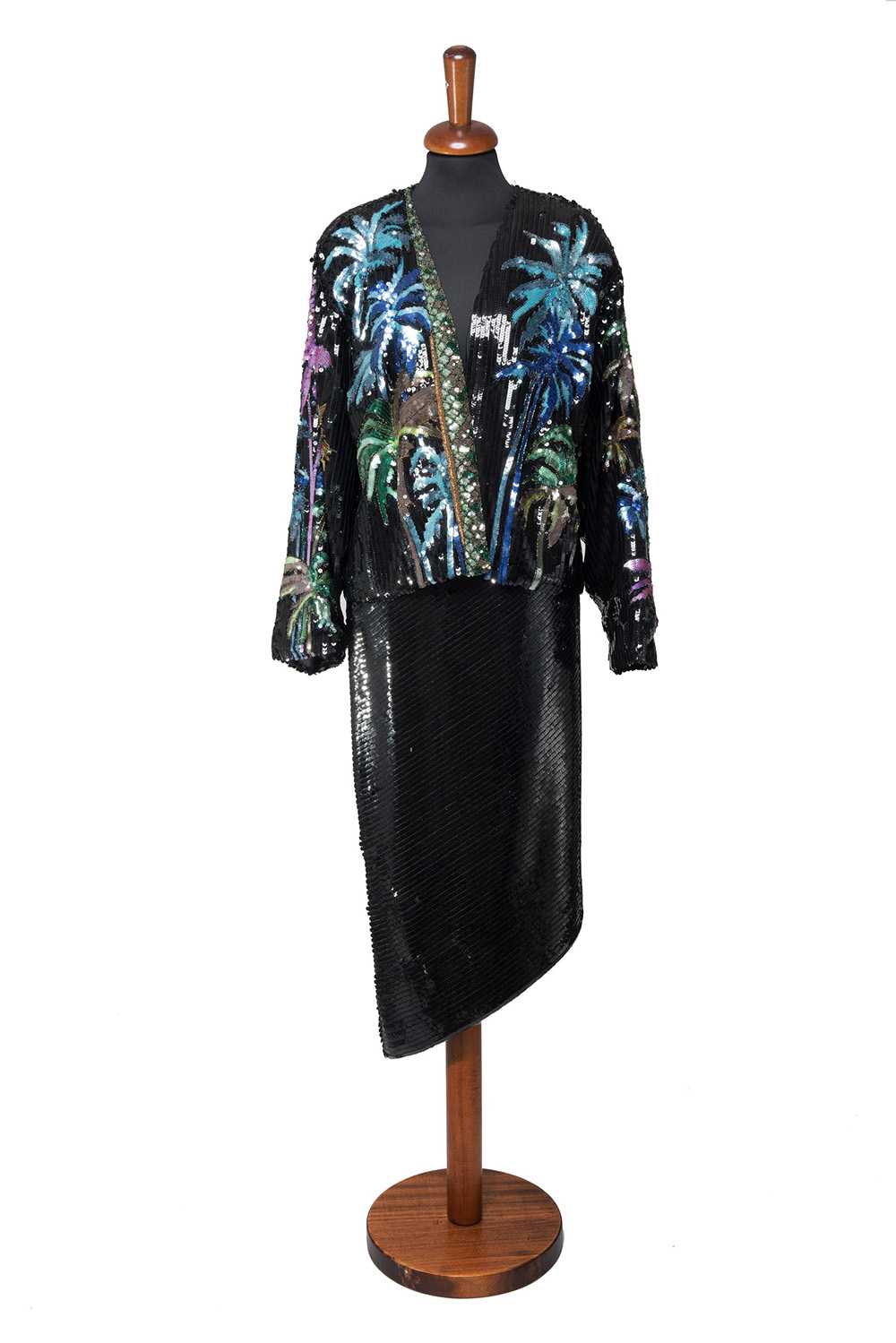Completo giacchino e gonna in tessuto rifinito con paillettes nere e nel giacchino vari altri colori a disegnare delle palme (tg 46)