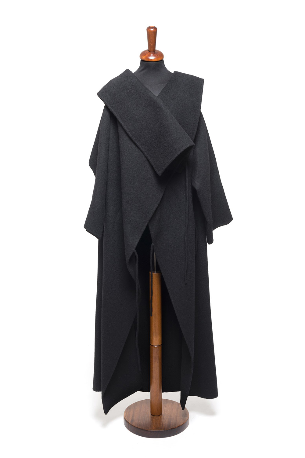 Particolare cappotto lungo in cashmere nero, come un rettangolo con maniche a ricordare antiche vesti orientali (tg 44)