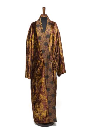 Lungo cappotto di ispirazione orientale in velluto imbottito cangiante dal giallo al bordeaux con inserti in garza lamè, finitura di fiori neri (tg. 42)