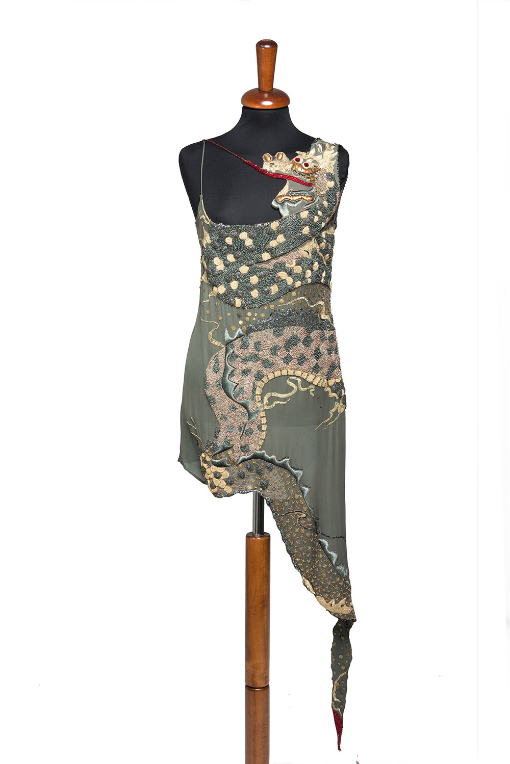 Miniabito con particolare scollo e spacco asimmetrico in seta color verde oliva e ricamo a ricordare un dragone orientale in tessuto e paillettes sui toni del verde, oro e rosso (tg 42)