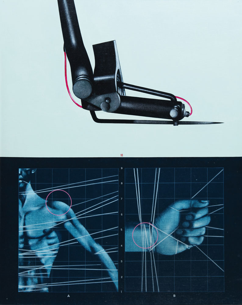 SERGIO SARRI Torino 07/04/1938 Attrezzo per analisi e schermo A - B, 1974 acrilici su tela cm. 100x80, firma, titolo, anno e timbri della Galleria Vinciana (MI) al retro, opera registrata presso l'Archivio Sergio Sarri al numero SS-06-1974, pubblicato su "Sergio Sarri, Opere dal 1964 al 2008, Catalogo ragionato" a cura di Ugo Paganini e Cristiano Ragni, Edizioni Overtime Art, pagina 151, al numero 388.