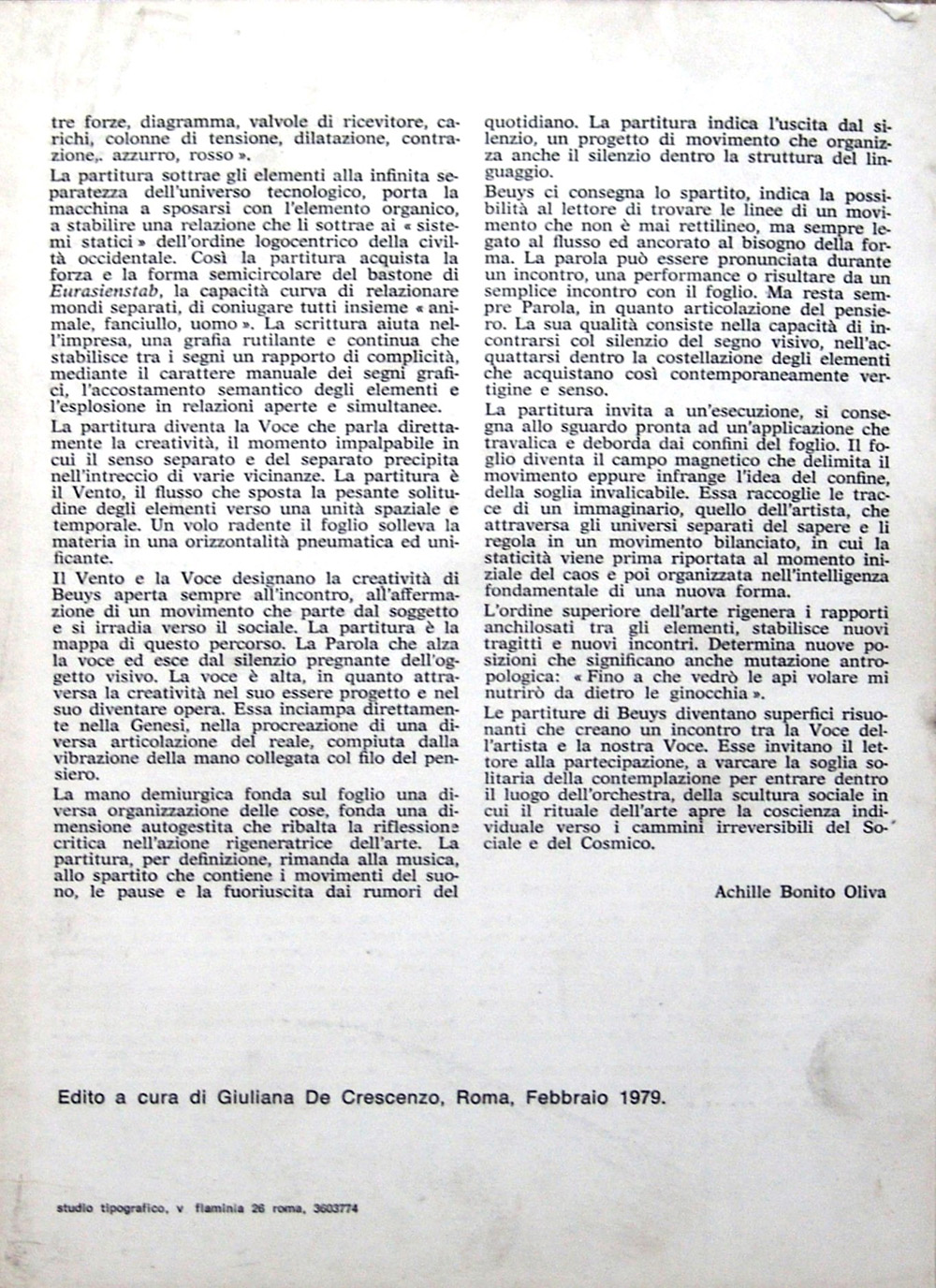 Joseph Beuys 1921, Krefeld - 1986, Dusseldorf - [Germania] Partiture della Genesi libro 24x17 cm 1979 libro a cura di Giuliana De Crescenzo, edizioni Lucio Amelio, introduzione di Achille Bonito Oliva certificato di autenticità Picenum