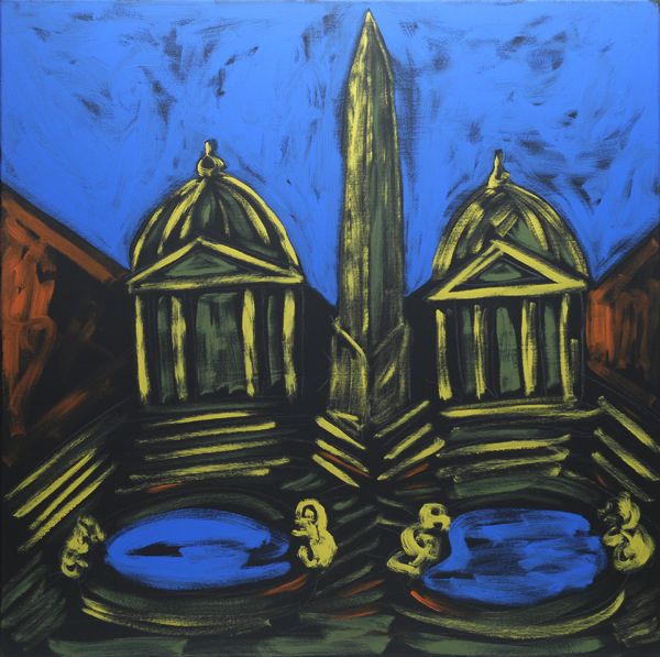 Tano Festa (Roma, 1938 - 1988) Obelisco, 1985 Acrilico su tela, cm. 100x100 Autentica su foto Studio Soligo, Roma, Archiviazione Opere Tano Festa recante n° arch. RMS58511080912.