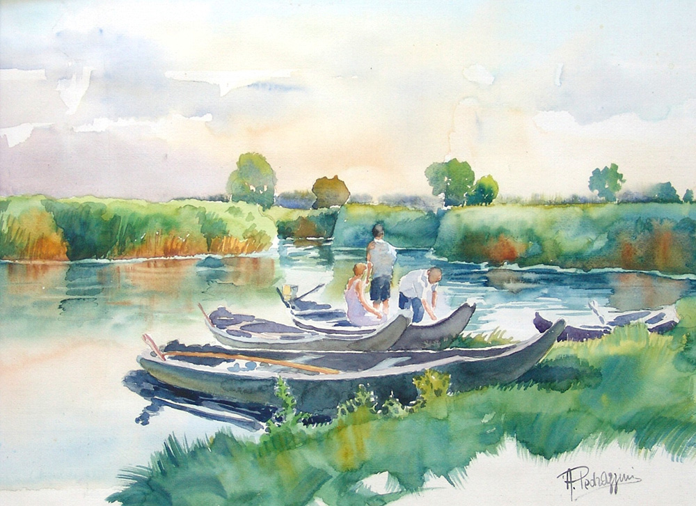 Aurelio Pedrazzini 1927, Milano (Mi) - [Italia] In barca sul fiume acquerello su carta 45x60 cm firma dell'artista in basso a destra; opera con cornice certificato di autenticità dell'artista