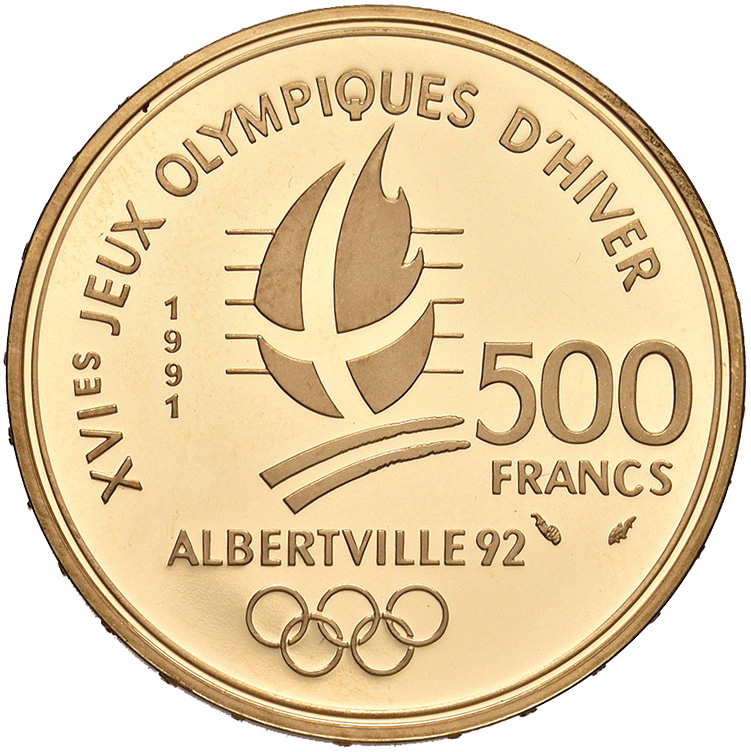 FRANCIA. Repubblica. 500 franchi in oro 1991 per i Giochi Olimpici d'Inverno,...