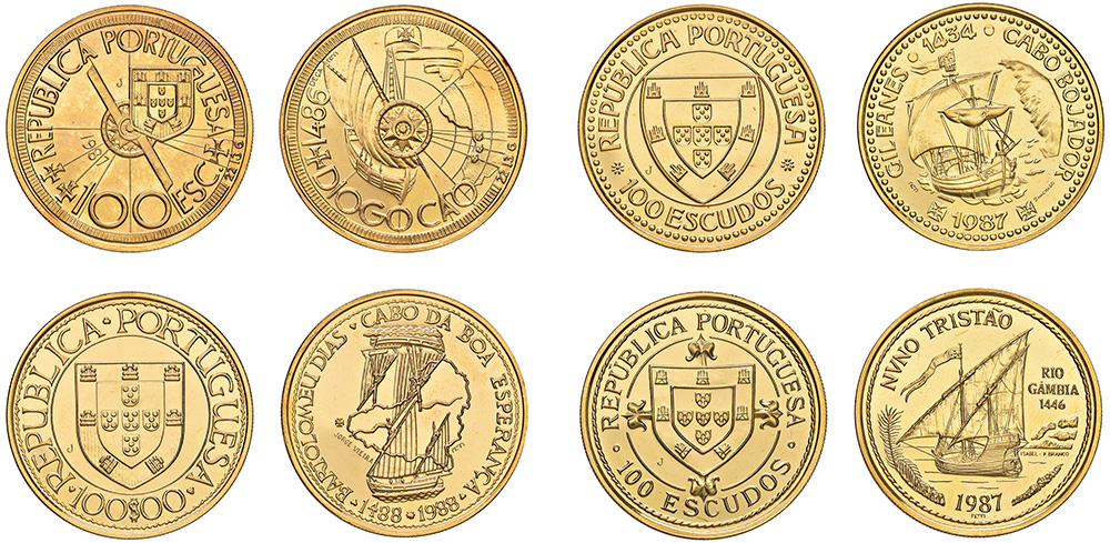 . Astuccio con 4 monete in oro da 100 escudos (3 del 1987 e uno del 1988) per i 500 anni delle scoperte portoghesi.