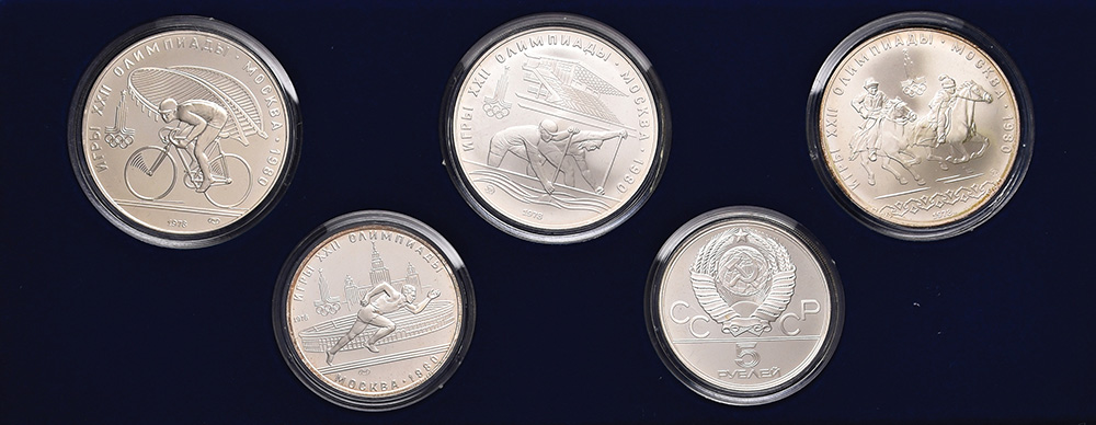 Astuccio con 5 monete in argento 1978 (tre da 10 rubli e due da 5) per le Olimpiadi di Mosca 1980. FDC.