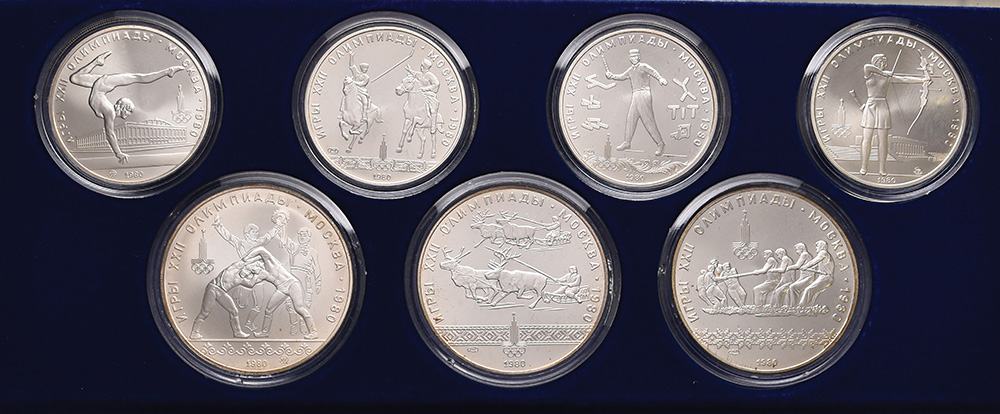 Astuccio con 7 monete in argento 1980 (tre da 10 rubli e quattro da 5) per le Olimpiadi di Mosca. FDC.
